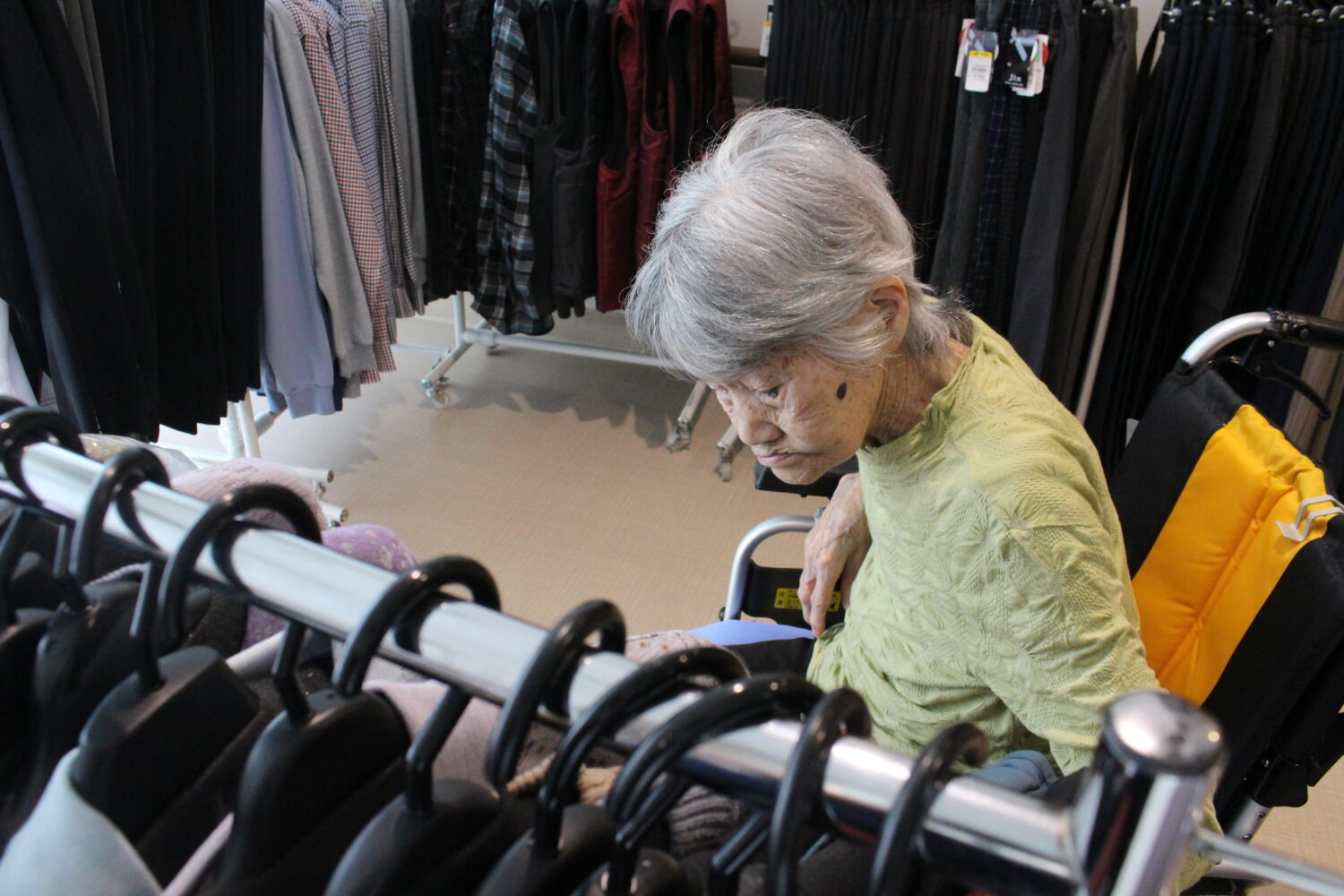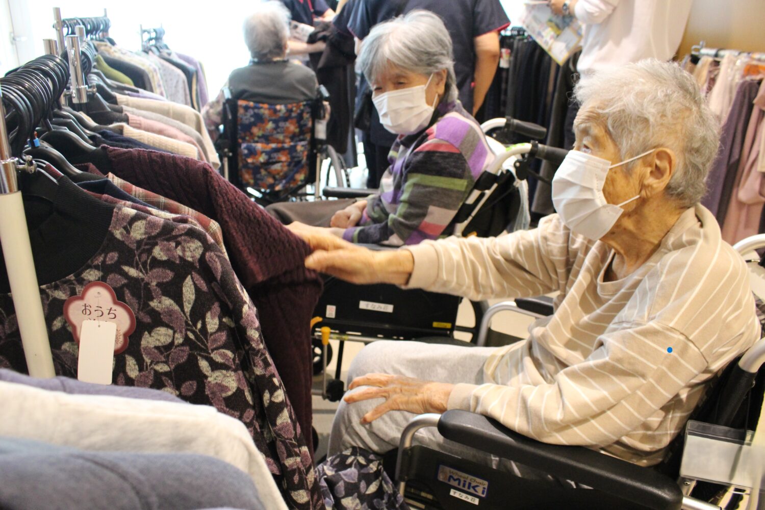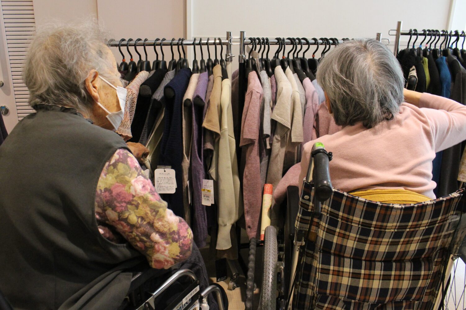 どれにする? - 2025.10.22 衣料品の訪問販売業者様に来荘いただき、ご利用者の方々に衣類の買い物を楽しんでいただきました。 廊下に並んだたくさんの商品。 買い物に来られた皆さんズラッと並んだ商品を目の前にしてどれにしようか迷っておられた様子。 こっちがいいか、あっちがいいかと他の利用者や職員と談笑しながら買い物を楽しんでおられました。 良さそうな服がたくさんあるわねえ。 たくさんあるから選ぶのに困るわ。どれにしようかねえ。 この色の服わたしに似合うかしら。