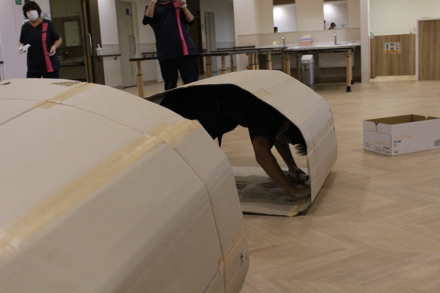 繋いだダンボールの輪の中に入って前に進んでいくぞ!