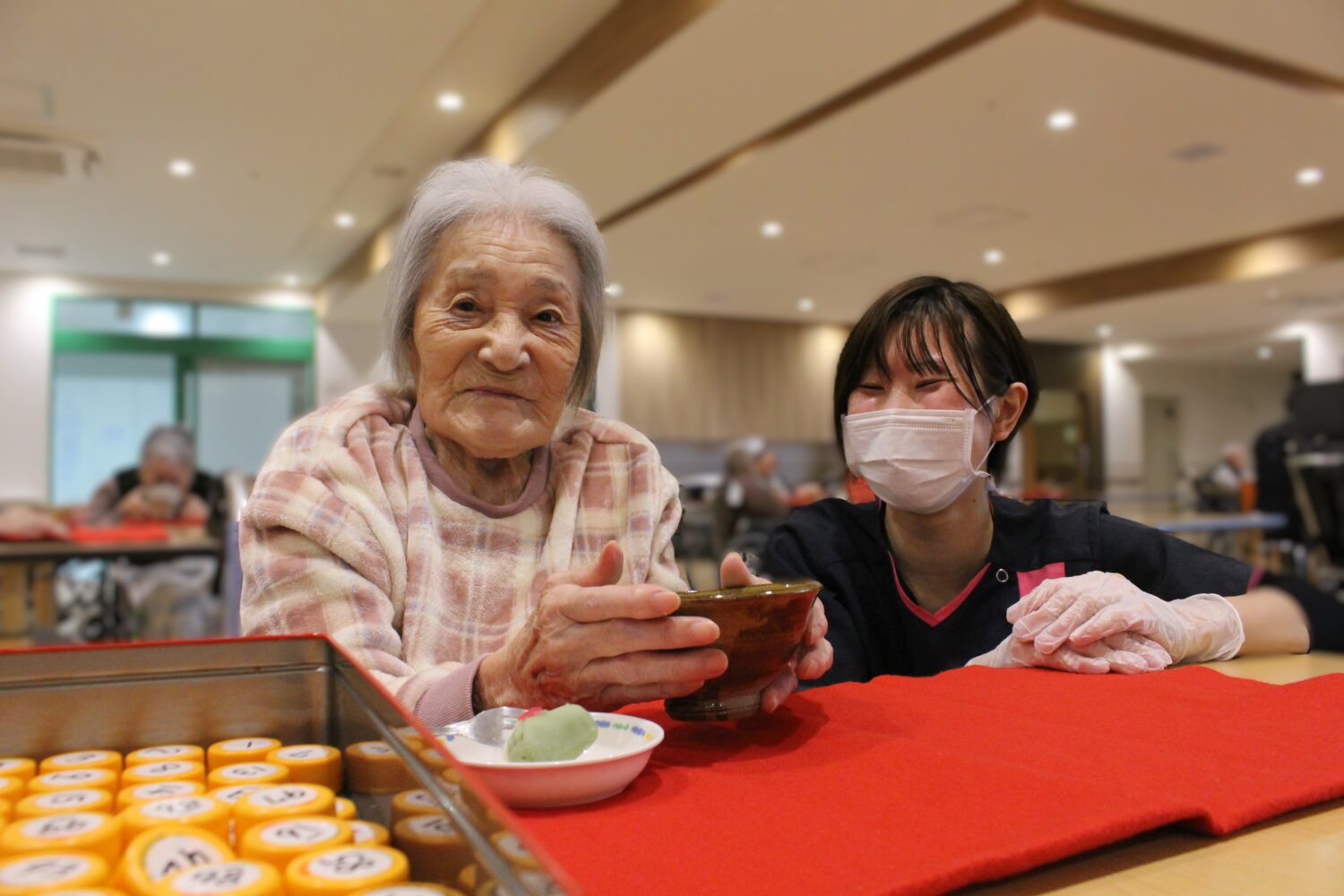 職員が慣れない手つきでお茶碗にお抹茶を立て、ご利用者の方々に楽しんでいただいています。